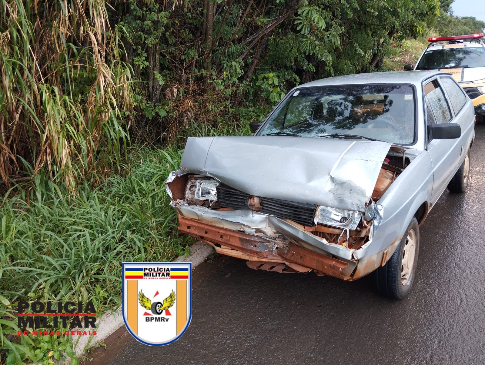 Ele conta que esse veículo freou devido uma poça d’água na vida, vindo a parar na pista de rolamento. O condutor ressalta ainda que conseguiu frear seu veículo e uma GM/S10 que era conduzida por W.G.F., de 39 anos freou logo atrás, porém, um outro veículo VW/Gol, conduzido por V.R.M., de 59 anos, não conseguiu parar e colidiu na traseira da S10 que, por sua vez, foi arremessada na traseira do GM/Cruze.