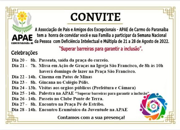 Apoiando esta missão a Associação de Pais e Amigos dos Excepcionais – APAE de Carmo do Paranaíba convida toda a população a participar.