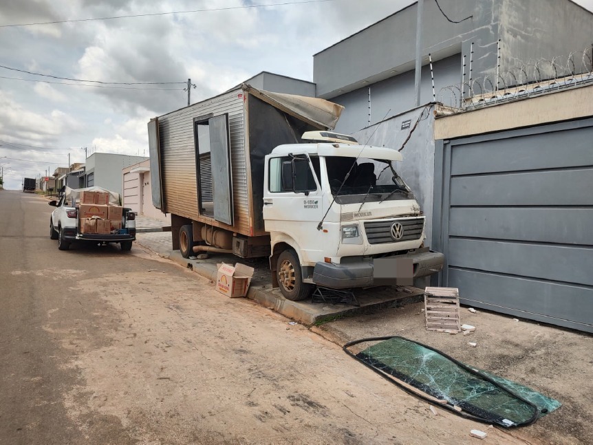 De acordo com as informações, o caminhão, modelo VW/9.150E Cummins, de cor branca, estava estacionado na Rua Alecrim do Campo quando, por razões ainda desconhecidas, perdeu os freios e começou a descer a rua. O veículo atingiu primeiro uma lixeira da casa e, em seguida, colidiu com o muro, os portões e outra lixeira da residência ao lado.