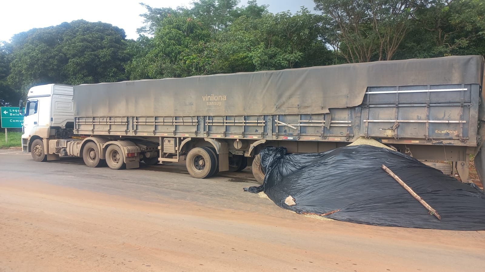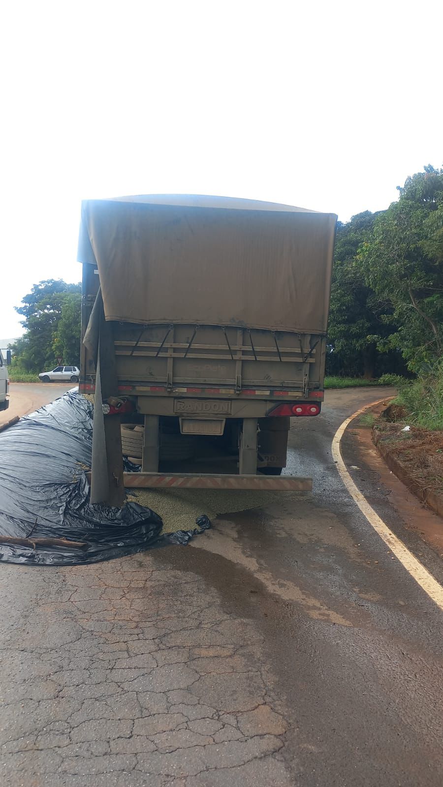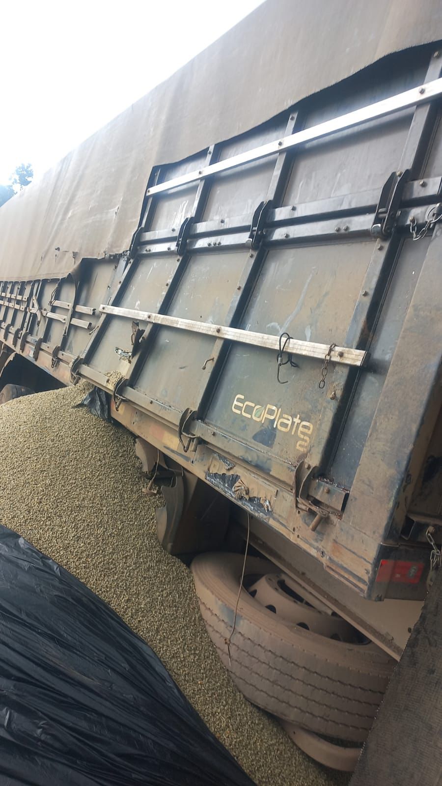 A carreta estava carregada com café beneficiado em grãos e, com o impacto, parte da carga ficou espalhada sobre a pista.