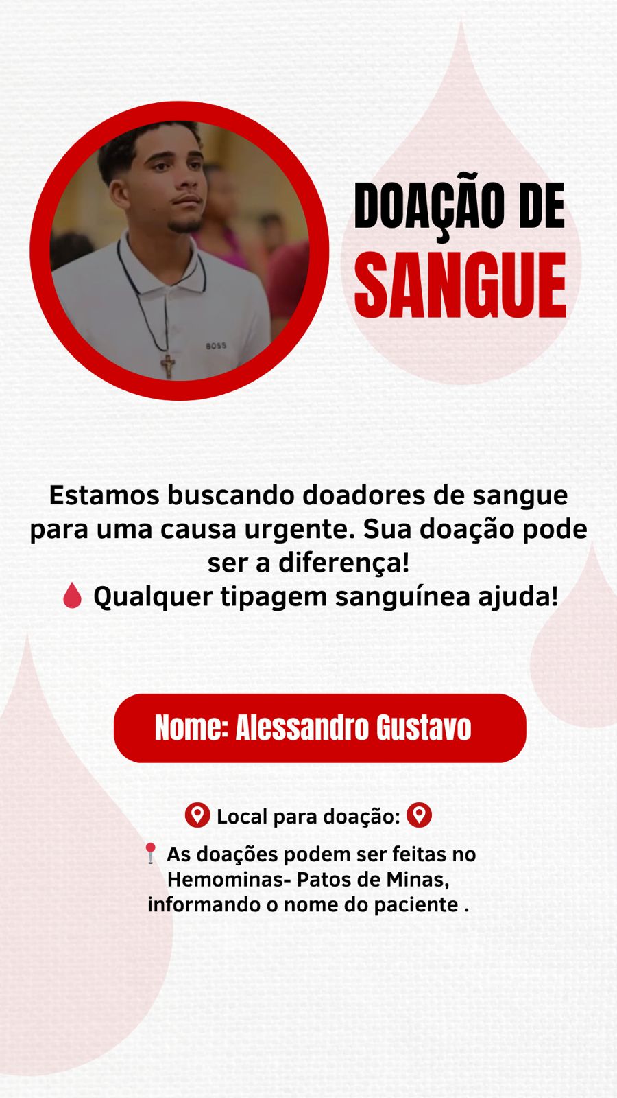 As doações devem ser realizadas no Hemominas, em Patos de Minas, informando o nome do paciente: Alessandro Gustavo.