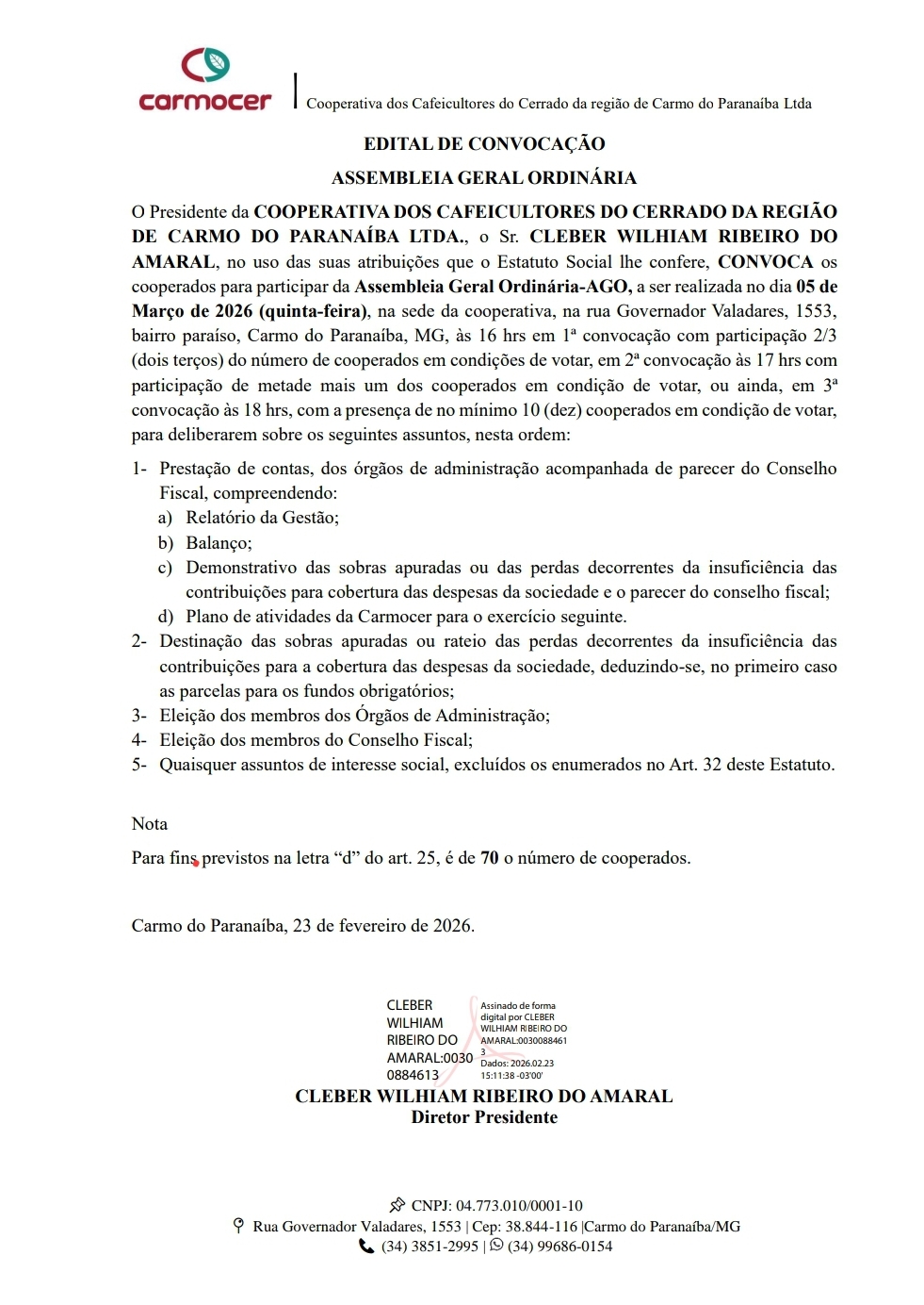 A CARMOCER, por meio do Diretor-Presidente Cleber William Ribeiro do Amaral, convoca os cooperados para a Assembleia Geral Ordinária (AGO). Este é o momento de acompanhar os resultados, compreender o cenário da cooperativa e participar das decisões que direcionam o futuro do que é de todos.
