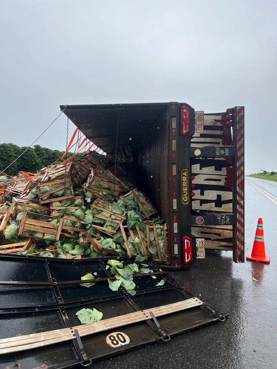 Segundo a Polícia Militar Rodoviária, a carreta transportava repolho e tombou sobre parte da pista, espalhando a carga pela via e pelas margens da rodovia. O condutor, um homem de 49 anos, natural do Paraguai, ficou preso dentro da cabine após o tombamento.