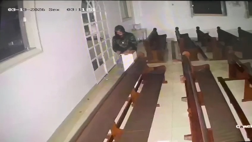 As imagens de segurança mostram que o criminoso agiu rapidamente. Segundo os registros, toda a ação durou menos de dois minutos, tempo suficiente para invadir o espaço, arrombar a caixa e fugir levando as doações feitas pelos fiéis.