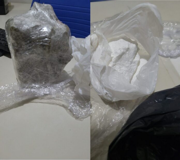 Durante as buscas forma localizados os celulares dos autores, além de uma pequena quantia em dinheiro, isqueiros, papéis para confecção de cigarros e cartão de crédito. Ao refazerem o trajeto da perseguição, os policiais encontraram os pacotes que foram jogados, sendo um de porção de substância análoga à maconha e outro de cocaína.