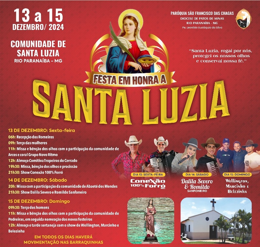 Após a missa, será serviço o almoço preparado pela Comitiva Tropeiros do Cerrado e às 19h30, será presidida outra celebração com a bênção dos olhos e procissão. Encerrando a noite às 21h30, acontece o show com a banda Conexão 100% Forró.