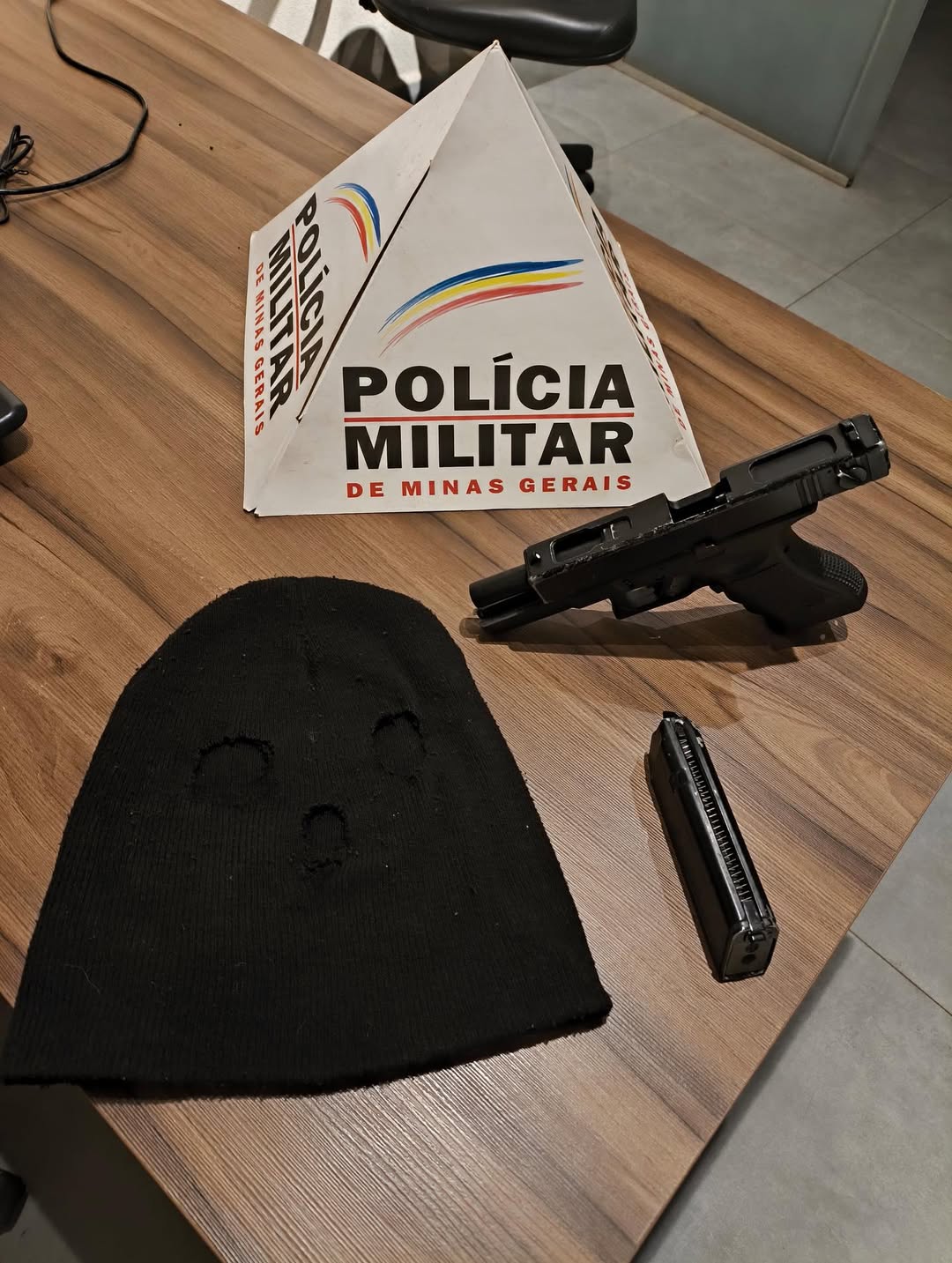 Durante a ação, foram apreendidos um simulacro de arma de fogo, uma touca ninja e uma bicicleta preta, utilizada pelo suspeito. O homem foi preso e conduzido à Delegacia de Polícia Civil para as demais providências.