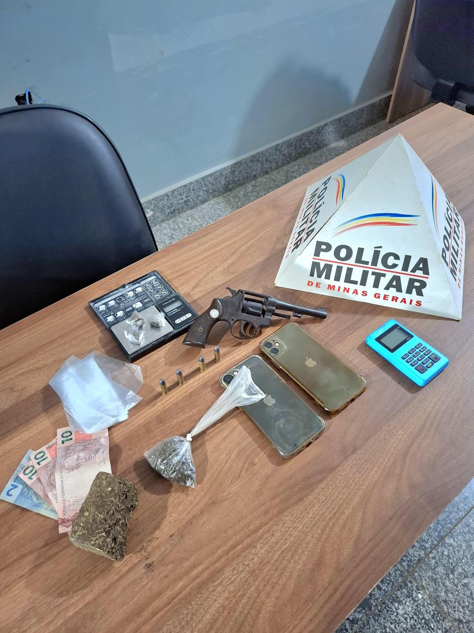 Durante as buscas no imóvel, os militares localizaram um revólver calibre .32, uma barra pequena de substância semelhante à maconha, além de buchas da mesma droga já embaladas e prontas para a venda. Também foram apreendidos uma balança de precisão, materiais usados para embalar entorpecentes, dois celulares, uma máquina de cartão de crédito e uma quantia em dinheiro.