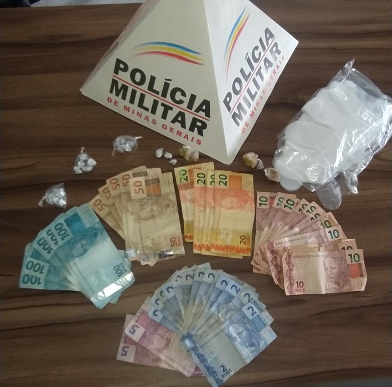 Com ele, os policiais encontraram três pacotes de crack, com cinco pedras no tamanho comercial; três pedras embaladas separadas e três pedras grandes além de sacos para embalar a droga e R4 988,00 em dinheiro.