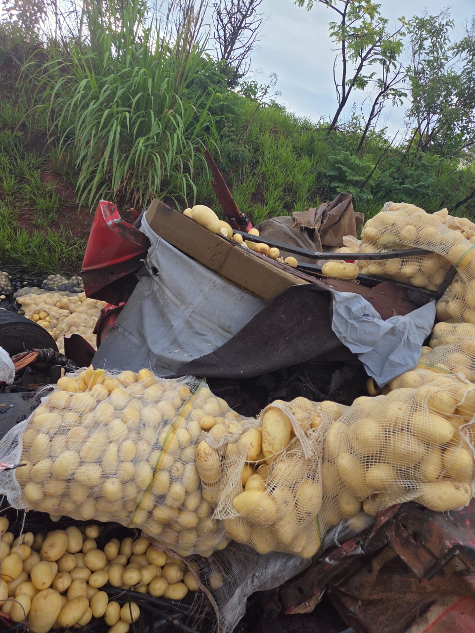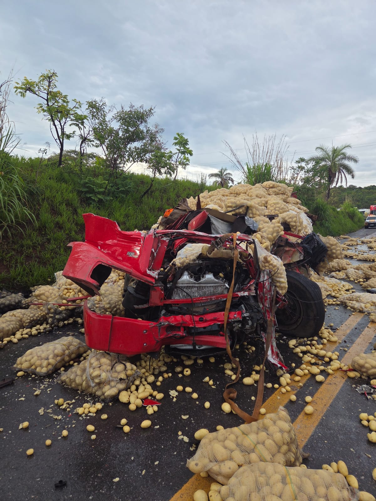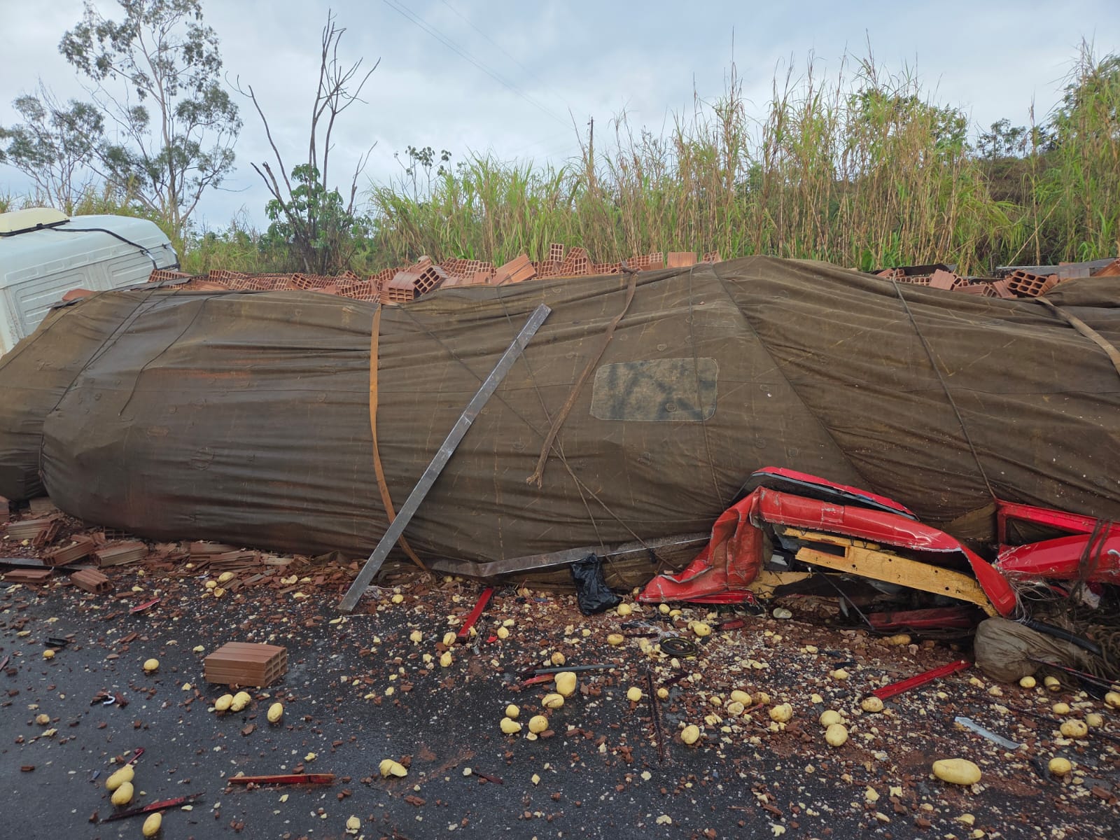 Com o impacto, parte da cabine do caminhão ficou prensada na carga de tijolos e o restante do veículo foi lançado cerca de 20 metros à frente. A carga de batatas se espalhou por toda a pista. Próximo ao caminhão, os policiais encontraram uma bolsa com uma cartela do medicamento Nobésio, que foi apreendido.
