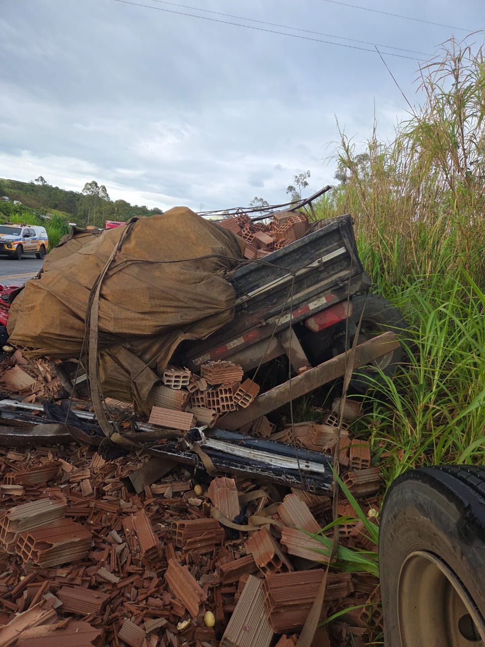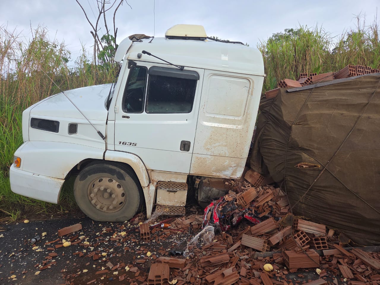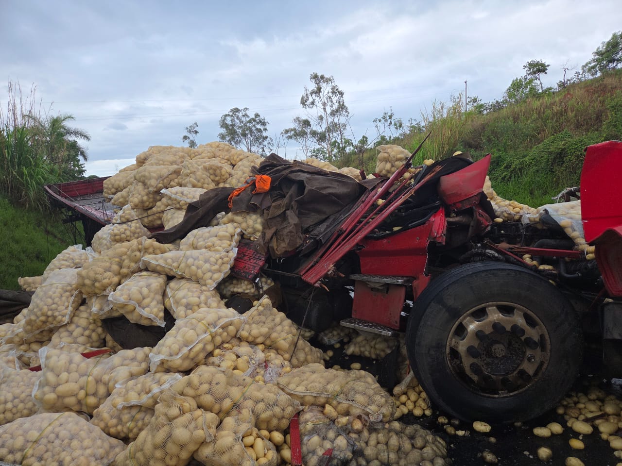 Com o impacto, parte da cabine do caminhão ficou prensada na carga de tijolos e o restante do veículo foi lançado cerca de 20 metros à frente. A carga de batatas se espalhou por toda a pista. Próximo ao caminhão, os policiais encontraram uma bolsa com uma cartela do medicamento Nobésio, que foi apreendido.