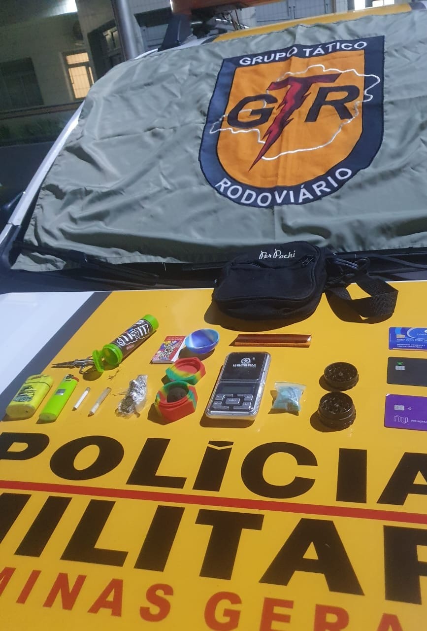 Durante a abordagem e fiscalização, o jovem demonstravam nervosismo e os policiais notaram um forte cheiro de maconha vindo do interior do carro. Com isso, foi feita a busca veicular e localizado uma mochila que continha um cartão bancário com o nome do autor, um tablete pequeno de maconha, uma bala de haxixe, 22 balas de ecstasy, além de dois cigarros de maconha já consumidos pela metade, um dichavador e uma balança de precisão.