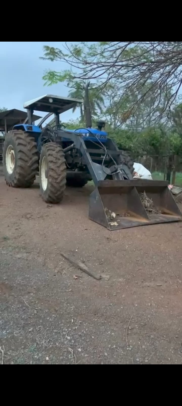 O trator é da marca New Holland, Modelo 7630 de cor azul e possui uma pá carregadeira na frente.