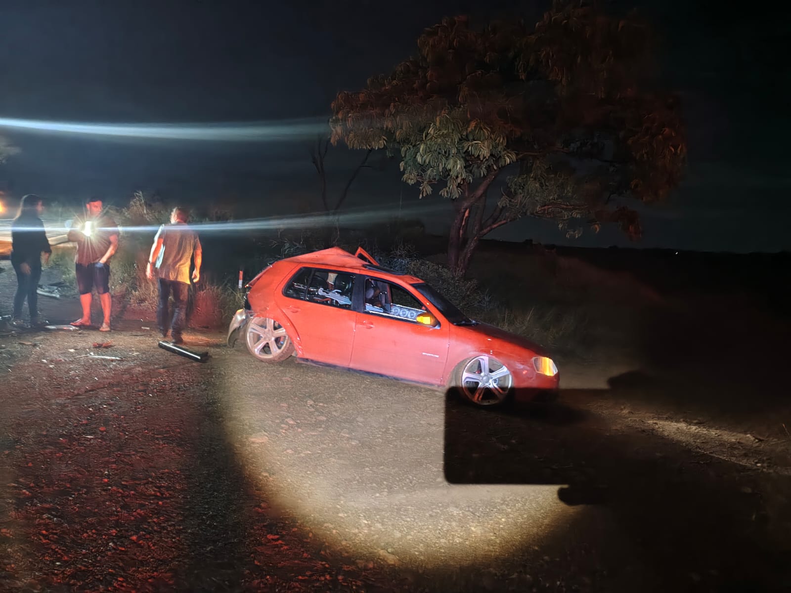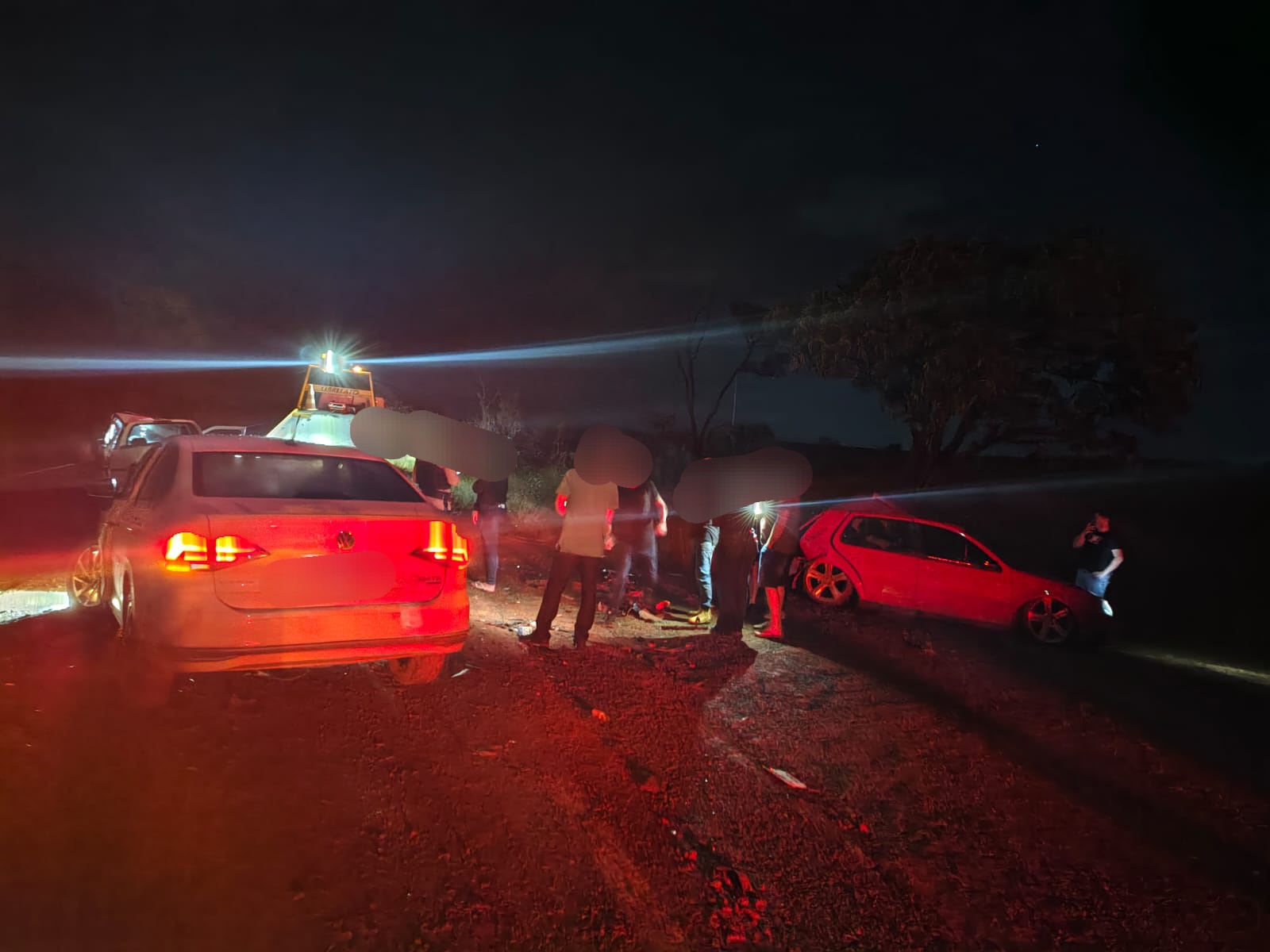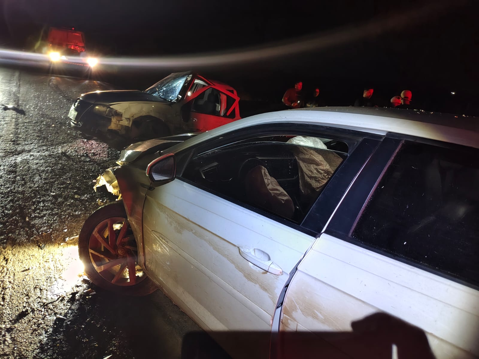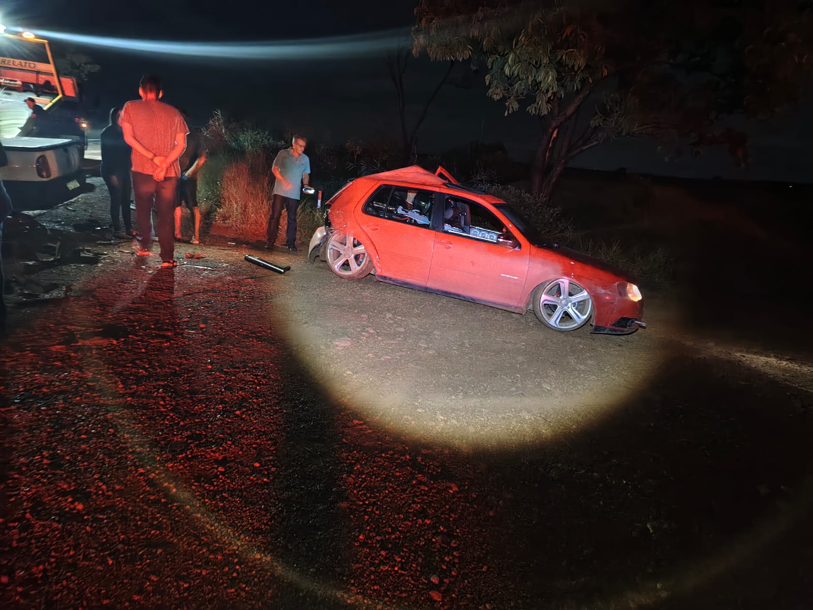 Com o impacto, a Saveiro acabou sendo projetada contra um VW Golf vermelho, que também estava estacionado no local, enquanto os condutores conversavam às margens da rodovia.