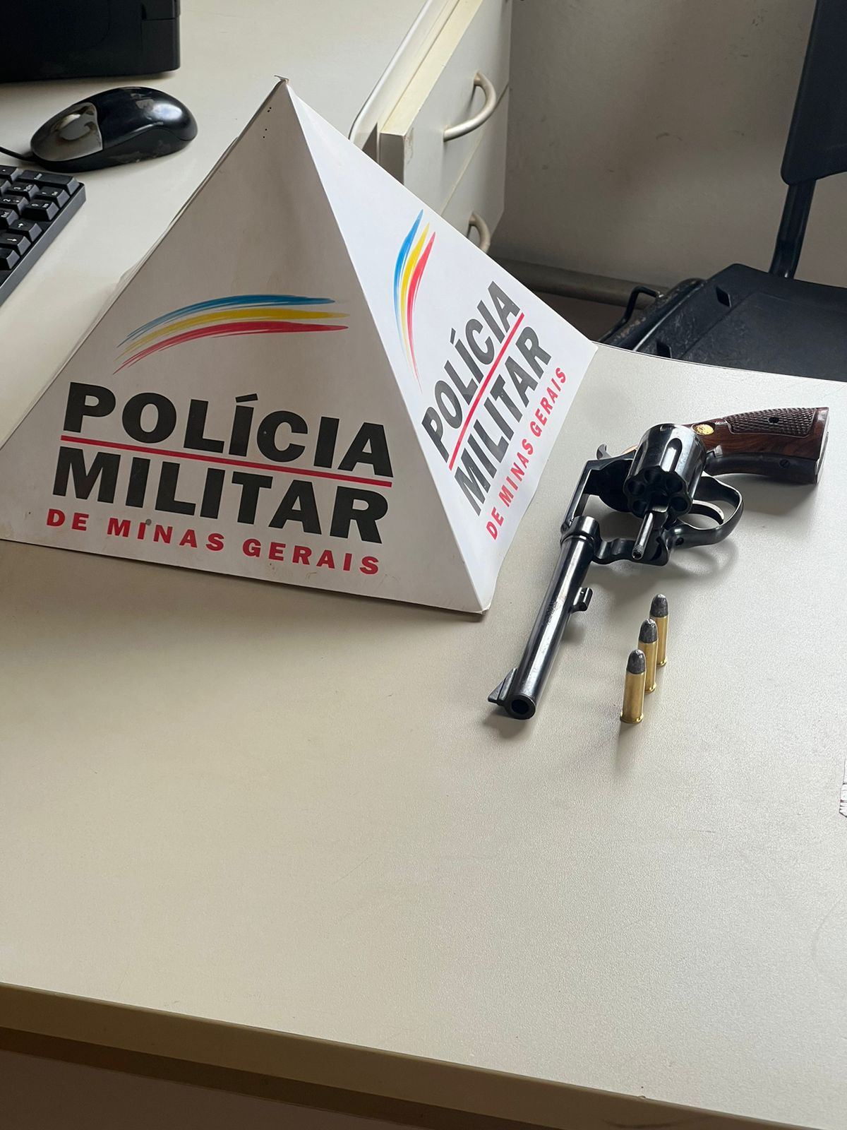 Os policiais entraram na casa, após buscas, foi localizado um revólver calibre .38 com três munições. Diante disso, o autor foi preso no local e levado para a Delegacia da Polícia Civil.
