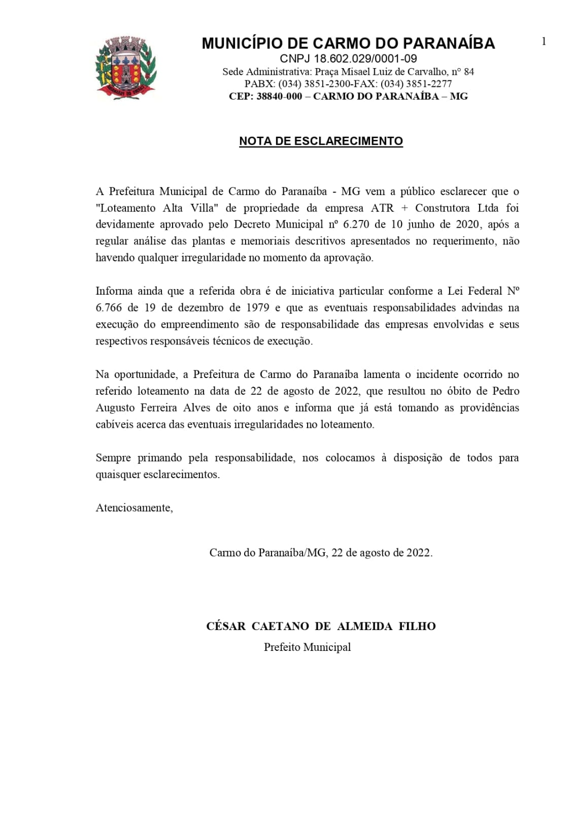 A Prefeitura de Carmo do Paranaíba, através do prefeito César Caetano (PL), emitiu uma nota na noite desta segunda-feira (22) e informou que o loteamento foi aprovado através do Decreto Municipal n° 6.270 no dia 10 de junho de 2020 e que a obra é de iniciativa particular, conforme a Lei Federal n° 6.766 de 19 de dezembro de 1.979.