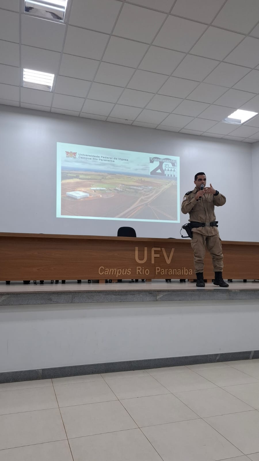 Durante a fala, o oficial apresentou orientações de segurança, ressaltando que o trabalho da Polícia Militar na proteção da comunidade universitária é baseado na proximidade com os estudantes e na construção de uma relação de confiança.
