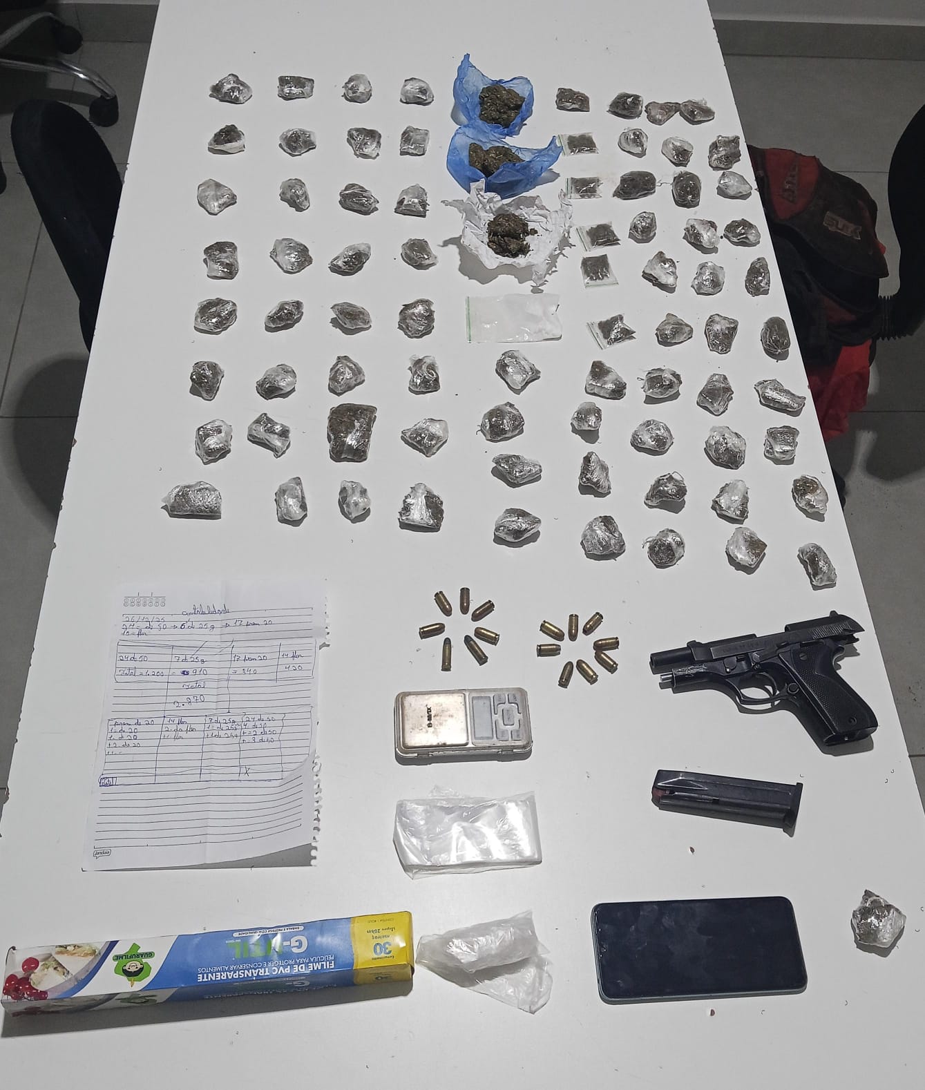 No mesmo local, os militares também apreenderam uma pistola, além de munições dos calibres .380 e .32. Segundo a corporação, a presença da arma de fogo reforça a gravidade da ocorrência e o risco à segurança pública.