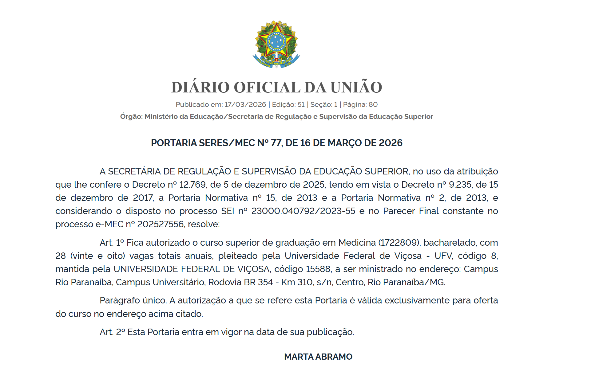 A autorização consta na Portaria SERES/MEC nº 77, de 16 de março de 2026, assinada pela secretária de Regulação e Supervisão da Educação Superior, Marta Abramo. O documento prevê a oferta de 28 vagas anuais para o curso de graduação em Medicina, na modalidade bacharelado, a ser ofertado no Campus Rio Paranaíba, às margens da BR-354.