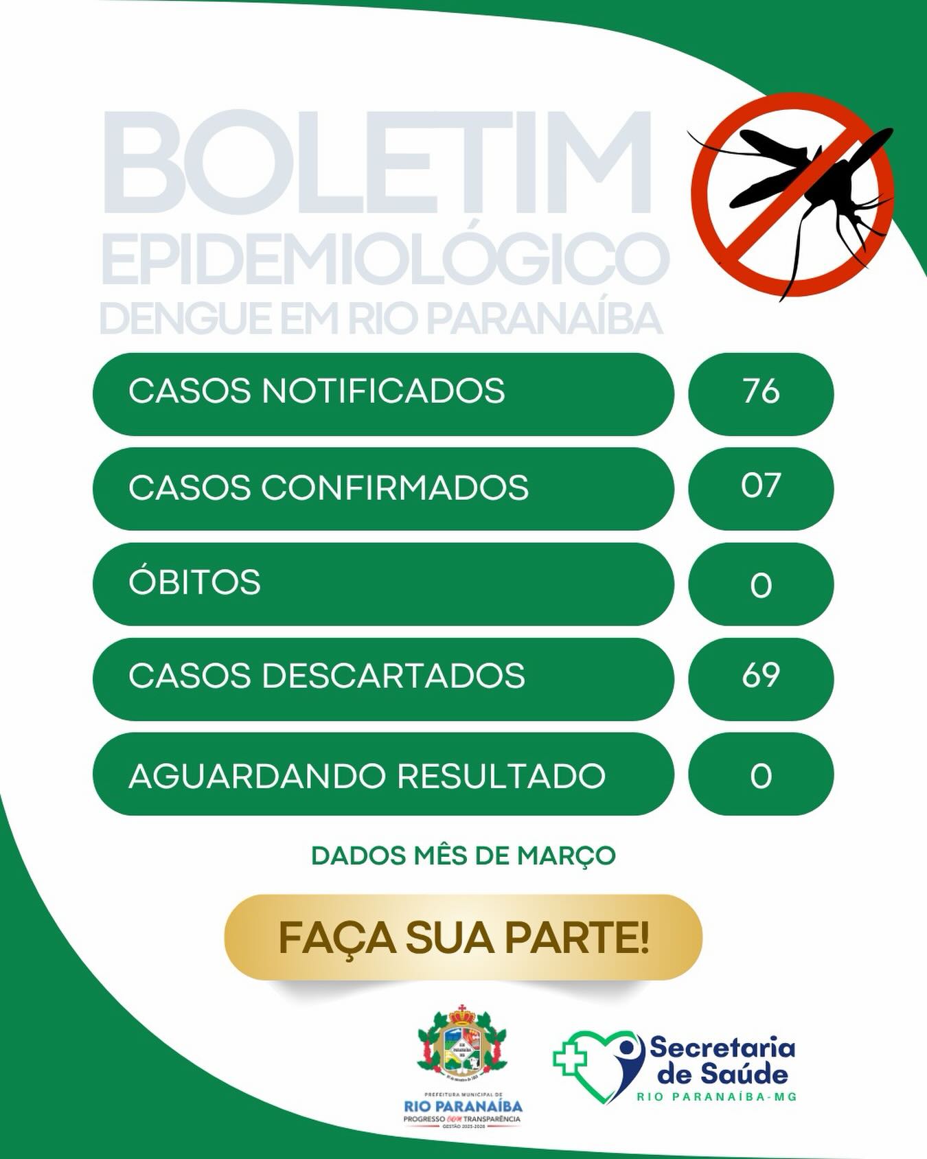 Ainda segundo os dados, o município não registra óbitos relacionados à dengue neste período.