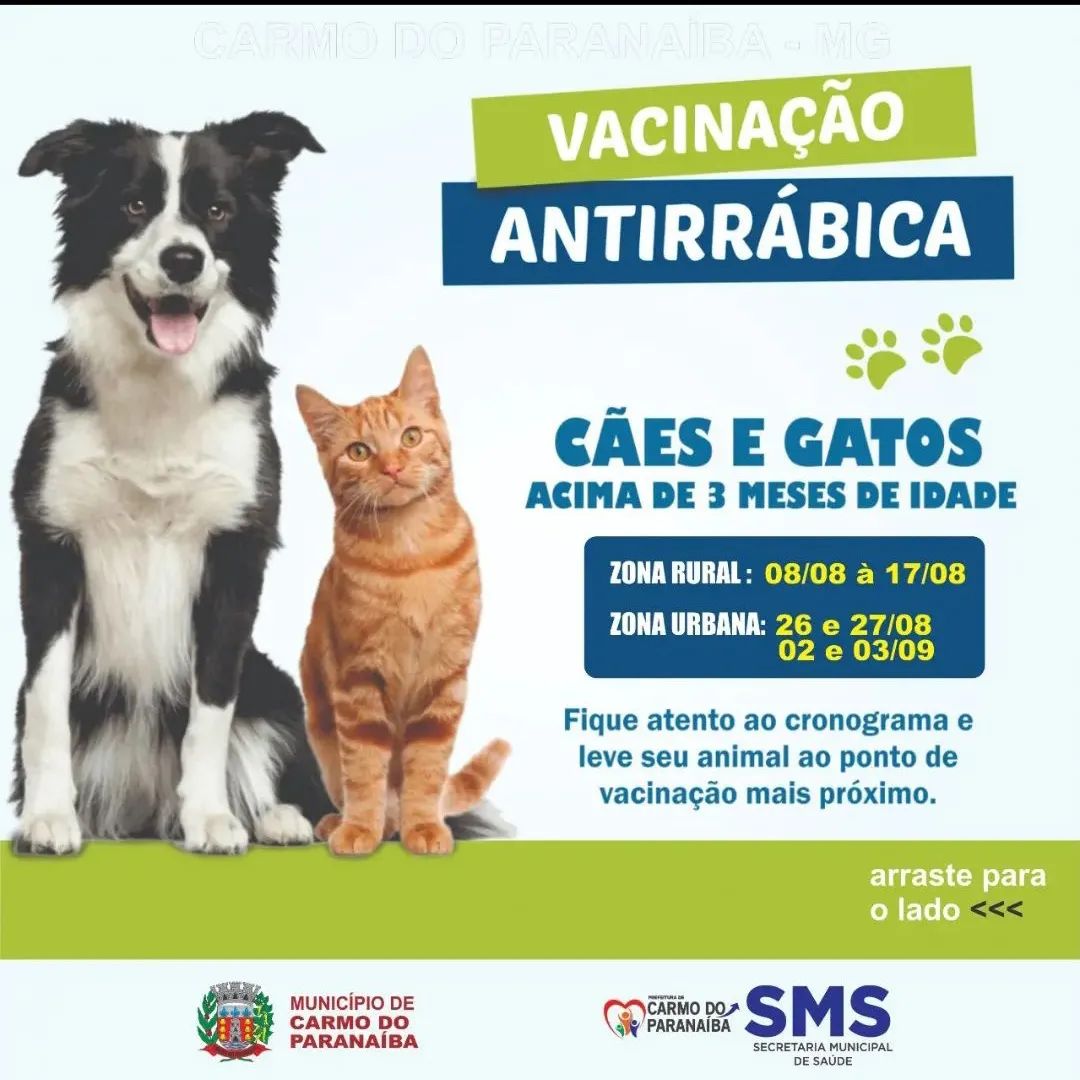 Neste primeira etapa na zona urbana, a vacinação de cães e gatos acontecerá nesta sexta e sábado das 08h às 11h e das 13h às 16h, nos seguintes locais: Poliesportivo e Igreja Santa Cruz no bairro Santa Cruz, PSF Paranaíba no bairro Paranaíba, Praça do Rosário no bairro Lagoinha e no PSF Paranaiba no bairro Paraíso.