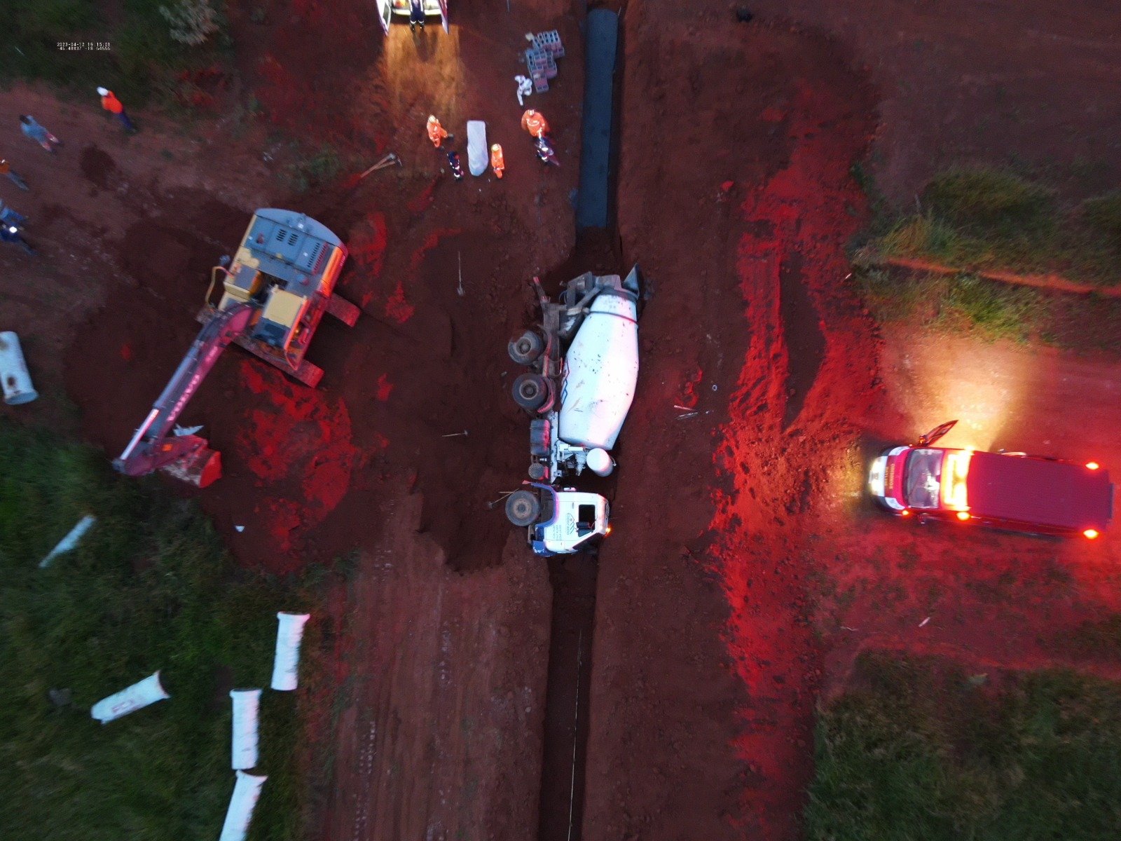 Segundo relatos iniciais de testemunhas, um caminhão tipo betoneira havia caído em um buraco soterrando um trabalhador. No local há uma escavação para realizar uma rede pluvial em que trabalhadores estavam dentro da valeta concretando o fundo desta valeta e o caminhão no plano acima fornecendo o concreto.